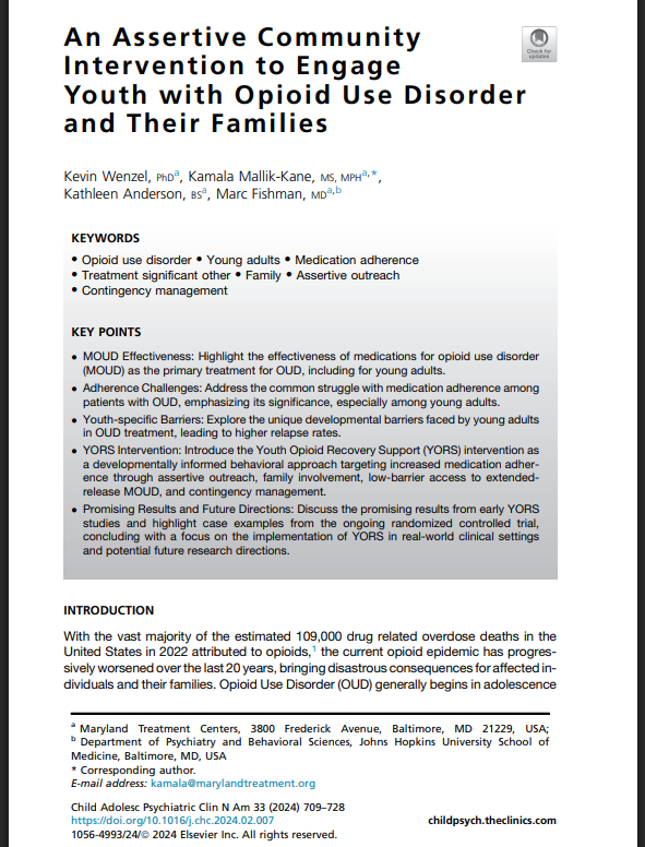Wenzel K, Mallik-Kane K, Anderson K, Fishman M. An Assertive Community Intervention to Engage Youth with Opioid Use Disorder and Their Families. Child Adolesc Psychiatr Clin N Am. 2024 Oct;33(4):709-728. doi: 10.1016/j.chc.2024.02.007. Epub 2024 Apr 6. PMID: 39277321; PMCID: PMC11571032.