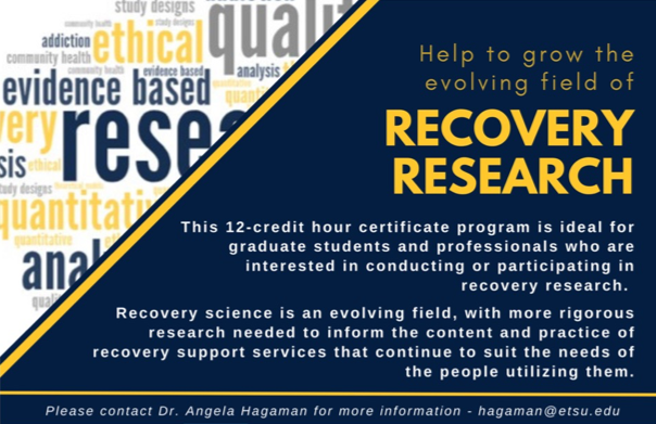 Beginning in the fall of 2026, East Tennessee State University will be offering a graduate certificate in revocery research. The certificate is designed for graduate students, members of regional health systems, addiction treatment facilities, and other community-based organizations (CBOs) that are interested in analyzing, conducting, or participating in studies about recovery support.